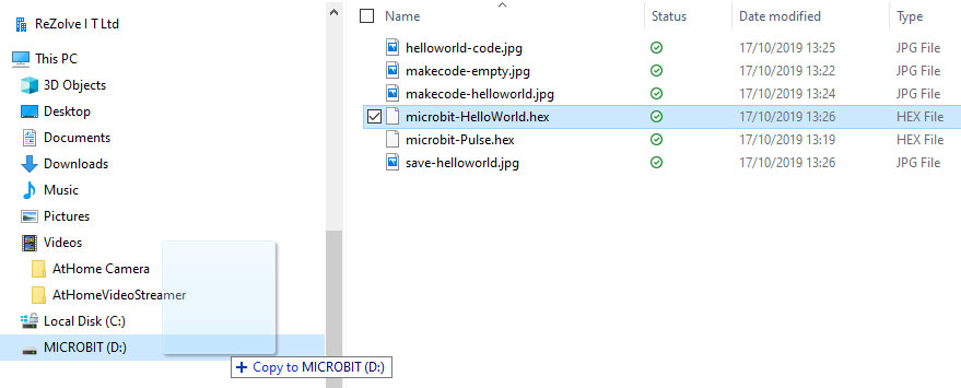 Click on the Download button and save the file to a folder on your computer or network. Once it’s saved you’ll notice that MakeCode adds the correct file extension so it becomes microbit-HelloWorld.hex.