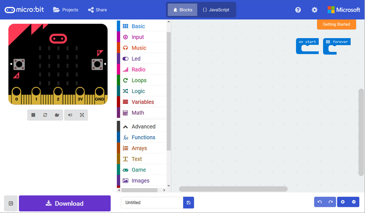 In the MakeCode editor you’ll see a simulation of a micro:bit on the left. This will run you code just as it would on the real thing so you can use it to test your code before copying onto the micro:bit.