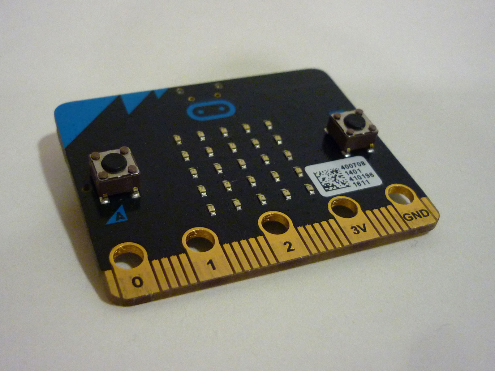 The micro:bit has a set of connectors (also called pins) on its edge connector. You can see 5 main pins, labelled 0, 1, 2, 3V and GND. If you look closer, you can see more, smaller pins in between. These pins connect to the motor driver board when we plug it in.