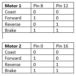 In our code we can alter the state of these pins, a bit like turning them on and off. In this way we communicate with the driver board and tell it what to do with the motors:
