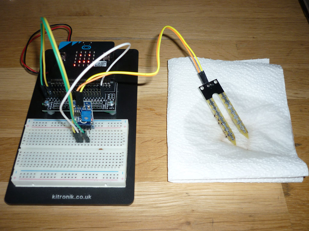 • In our example we have used both a breakout board for the micro:bit and a prototyping breadboard to make the connections. In theory you could connect the sensor directly to the micro:bit using crocodile clips but this is likely to be unreliable in practice.